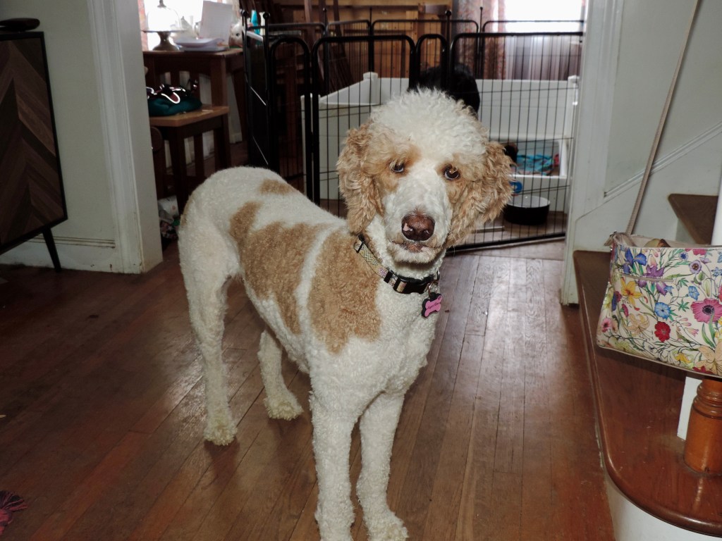 Sugar Boo is our newest addition and is a white and red parti AKC Standard Poodle. She is full of energy and loves kids!